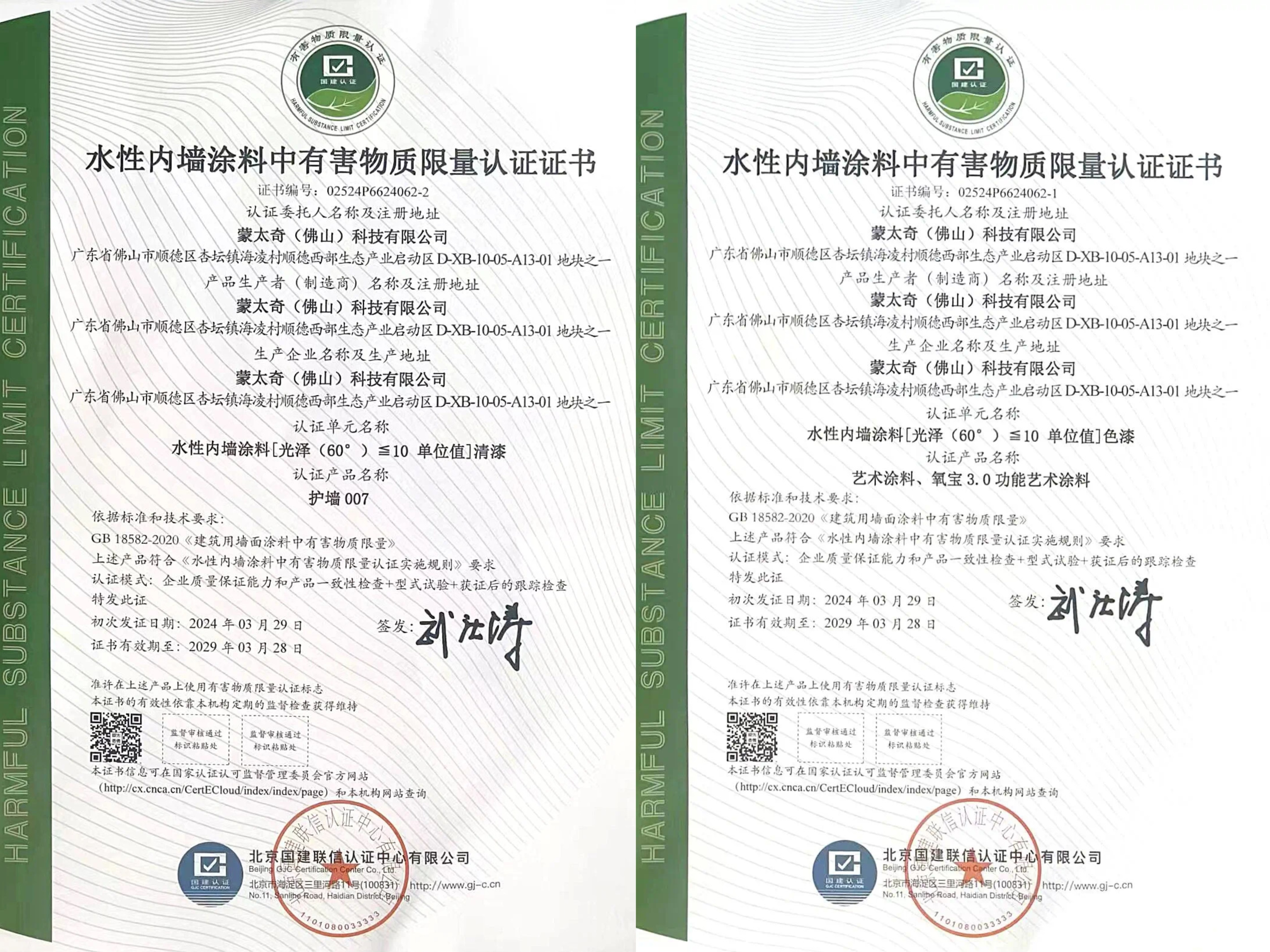 此次《水性內牆塗料中有害物質限量認證》證書由蒙太奇生產管理公司—蒙太奇(佛山)科技有限公司取得。