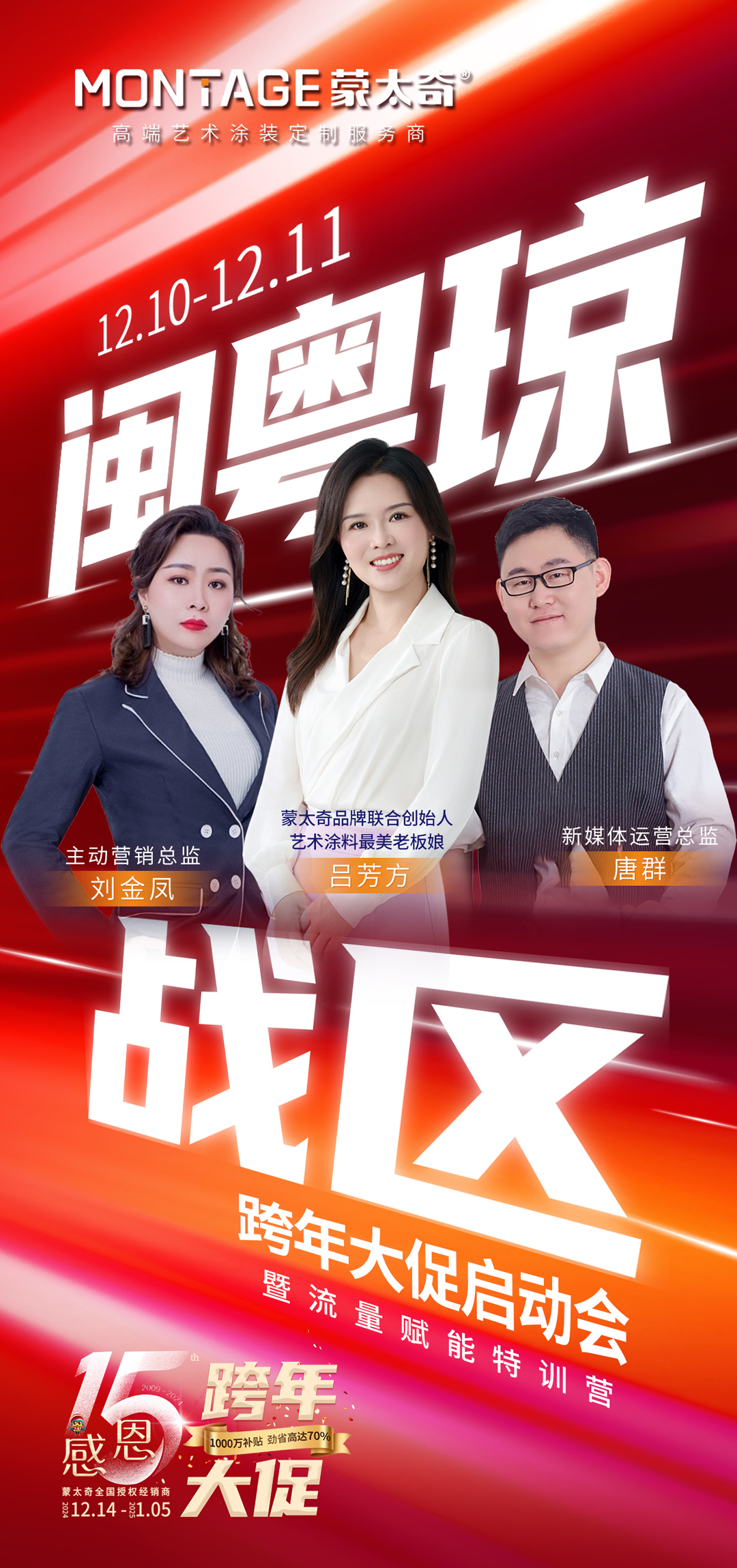 12月10日—11日,為期兩天的蒙太奇“粵閩瓊戰區跨年大促啟動會暨流量賦能特訓營”順利結營。此次培訓不僅屬於福建、廣東、海(hai)南(nan)三(san)地(di)的(de)聯(lian)動(dong)特(te)訓(xun),更(geng)通(tong)過(guo)直(zhi)播(bo)形(xing)式(shi)覆(fu)蓋(gai)到(dao)了(le)全(quan)國(guo)經(jing)銷(xiao)商(shang)。特(te)訓(xun)營(ying)旨(zhi)在(zai)幫(bang)助(zhu)終(zhong)端(duan)門(men)店(dian)提(ti)升(sheng)新(xin)媒(mei)體(ti)實(shi)戰(zhan)能(neng)力(li),通(tong)過(guo)專(zhuan)業(ye)課(ke)程(cheng)培(pei)訓(xun),熟(shu)練(lian)運(yun)用(yong)新(xin)媒(mei)體(ti)營(ying)銷(xiao)工(gong)具(ju),拓(tuo)寬(kuan)門(men)店(dian)獲(huo)客(ke)渠(qu)道(dao),為(wei)跨(kua)年(nian)大(da)促(cu)做(zuo)好(hao)衝(chong)刺(ci)準(zhun)備(bei)。