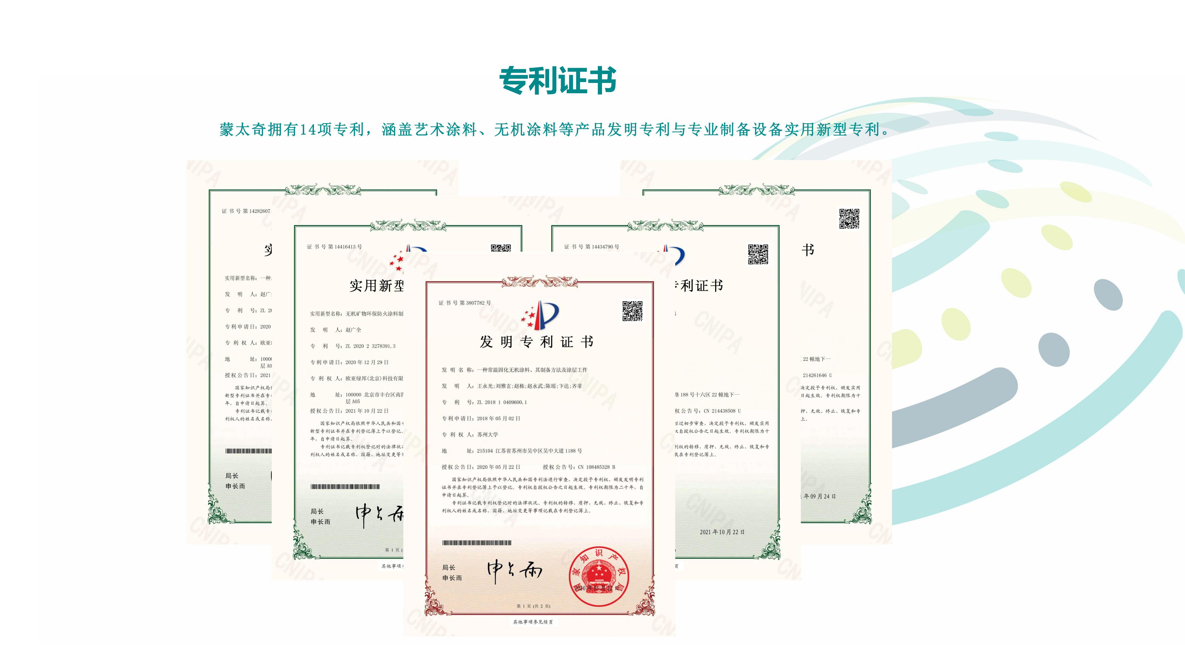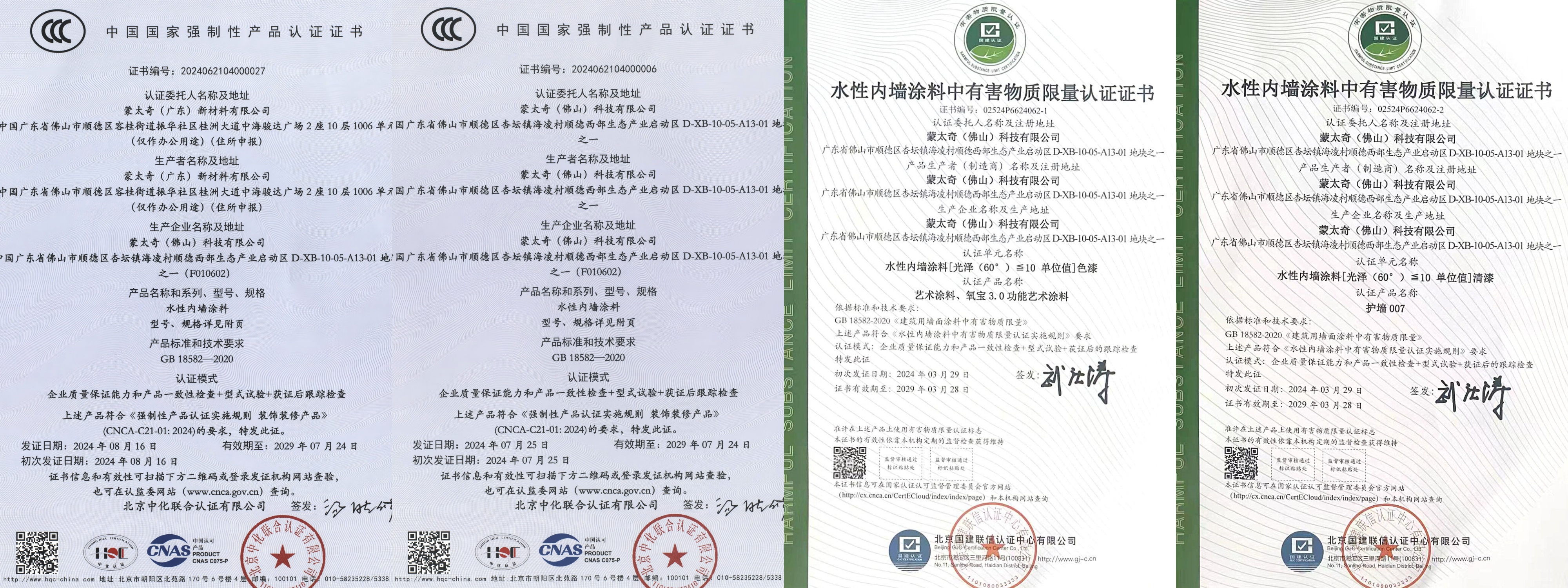 在此專利獲準前,蒙太奇已擁有14項專利,涵蓋藝術塗料、無機塗料等產品發明專利與專業製備設備實用新型專利。在嚴格遵循國家標準、通過基礎認證的基礎上,蒙太奇主動對標國際先進水平,成為行業首批獲得《水性內牆塗料中有害物質限量認證》及3C強製產品認證的雙資質品牌。這些技術成果與權威認證的積累,不僅印證了蒙太奇的研發實力,更為藝術塗料行業的標準化建設添磚加瓦,推動行業邁向新高度。
