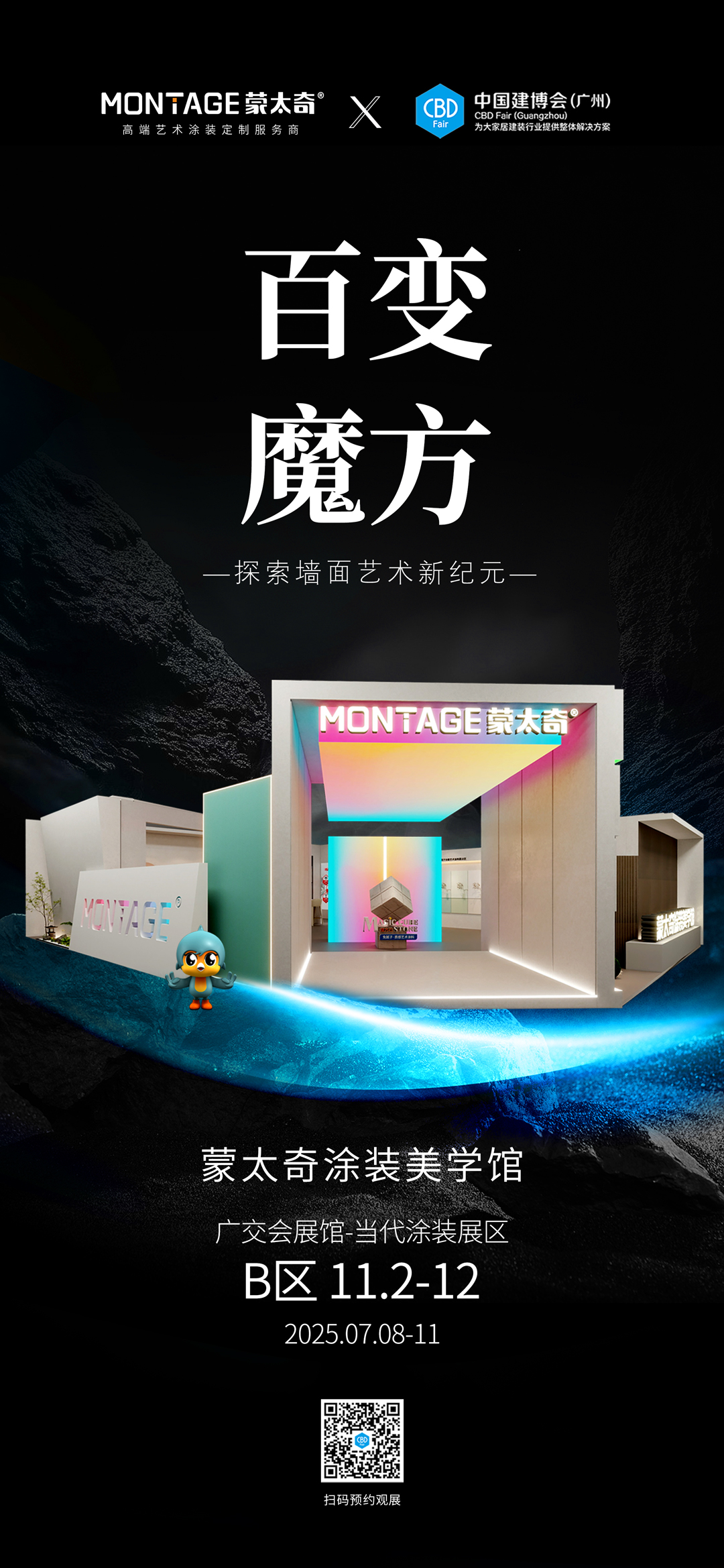 2025 年 7 月 8 日 - 11 日,亞洲規模最大、品類最全、影響力首屈一指的建築裝飾領域頂級盛會——第 27 屆廣州建博會將震撼上演。作為藝術塗裝專業強勢品牌,蒙太奇將以“百變魔方石·藝術煥家妝”為主題,從產品創新到工藝革新,從色彩美學到空間藝術,從功能突破到場景表達,從藝術塗裝靈感到材料科技應用,攜5大亮點與您共賞一段“魔方”煥家妝之旅。