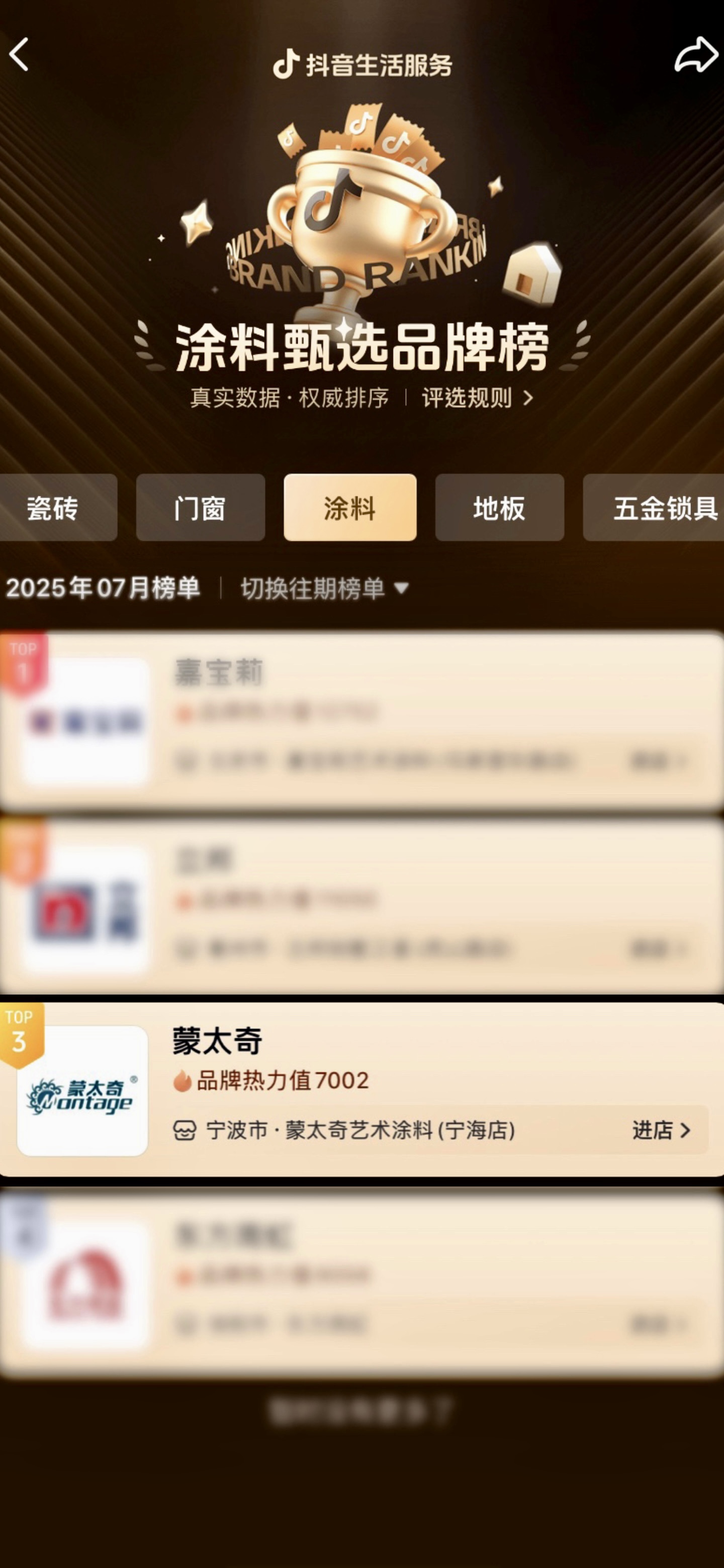 近日,抖音生活服務重磅發布行業權威榜單,蒙太奇藝術塗料憑借卓越的產品品質與深厚的消費者口碑,成功榮膺【抖音生活服務·塗料甄選品牌榜TOP3】。這(zhe)一(yi)榮(rong)譽(yu)不(bu)僅(jin)是(shi)對(dui)蒙(meng)太(tai)奇(qi)品(pin)牌(pai)市(shi)場(chang)影(ying)響(xiang)力(li)的(de)權(quan)威(wei)認(ren)可(ke),更(geng)彰(zhang)顯(xian)了(le)其(qi)作(zuo)為(wei)藝(yi)術(shu)塗(tu)料(liao)領(ling)域(yu)創(chuang)新(xin)引(yin)領(ling)者(zhe)的(de)強(qiang)勁(jin)實(shi)力(li),為(wei)行(xing)業(ye)樹(shu)立(li)了(le)數(shu)字(zi)化(hua)營(ying)銷(xiao)新(xin)標(biao)杆(gan)。