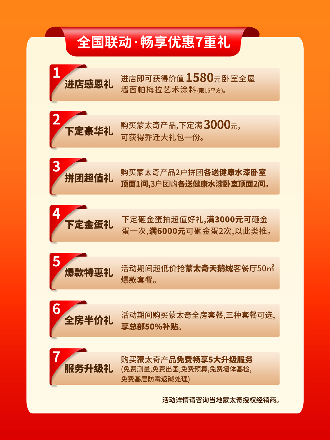 蒙太奇618年中大促作為2024年上半年第一場大型活動,遇上家裝旺季,正是衝量爆發的重要時期,為客戶帶來誠意滿滿的裝修福利,提供「進店感恩禮、下定豪華禮、拚團超值禮、下定金蛋禮、爆款特惠禮、全房半價禮、服務升級禮」等多重升級豪禮。