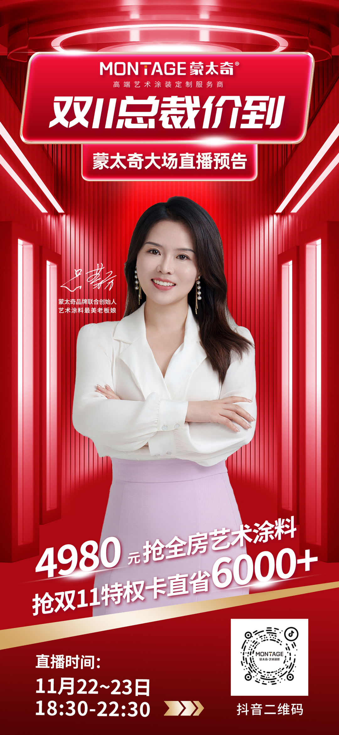 蒙太奇雙11補貼季活動進入最後衝刺階段!蒙太奇聯合創始人、藝術塗料最美老板娘呂芳方女士,將攜重磅豪禮空降蒙太奇官方品牌直播間狂撒福利。11月22日至23日晚18點30分至22點30分,蒙太奇雙11終極大場直播,狂歡加碼,超燃給利,多重優惠福利值得期待!