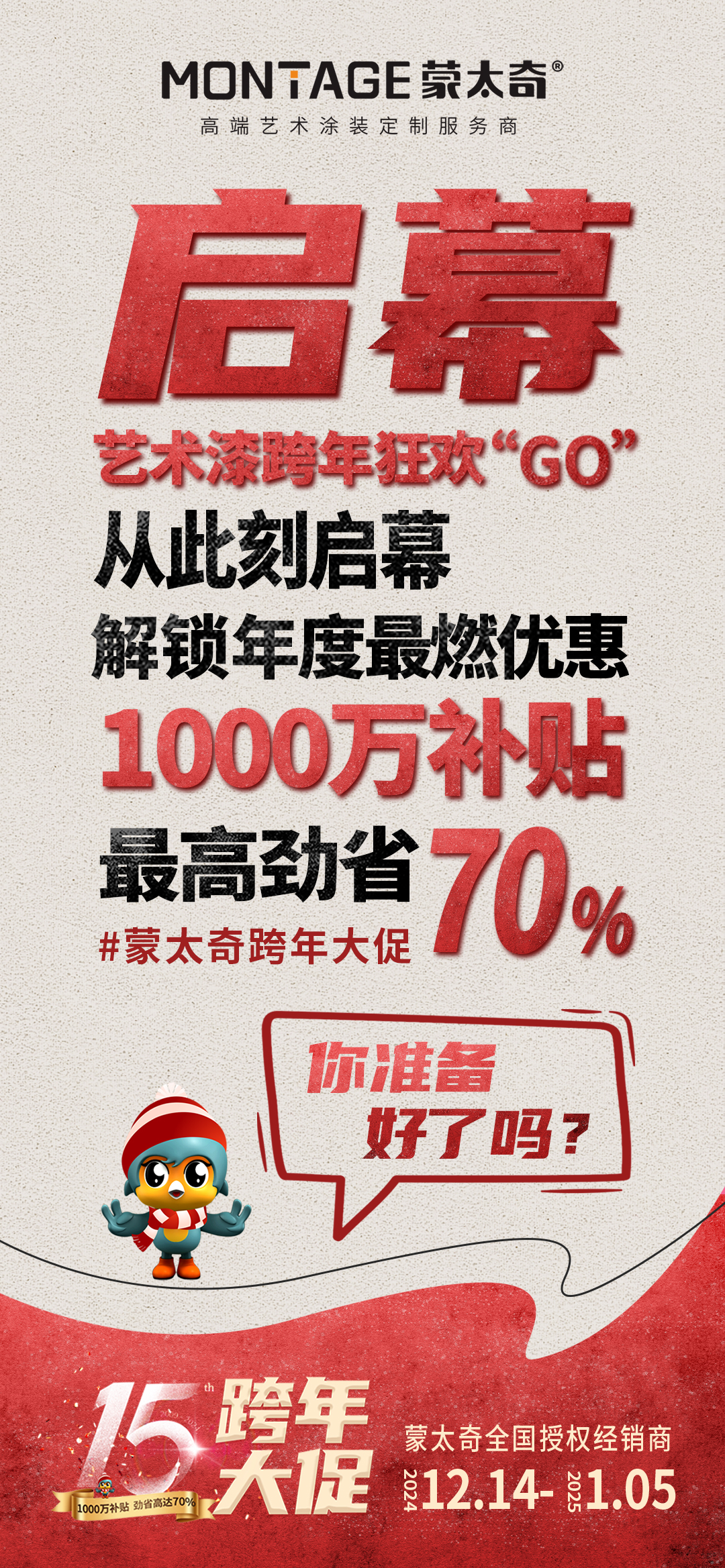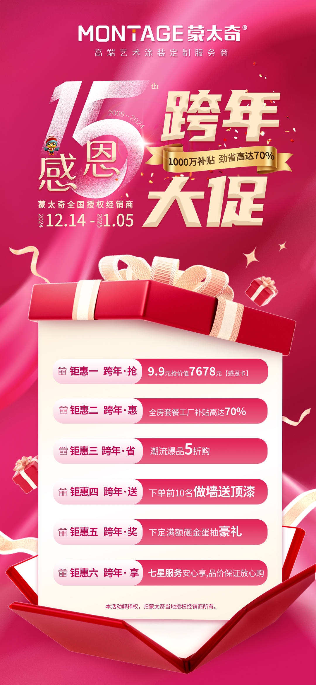 感恩同行,蒙太奇15周年答謝活動恰逢跨年煥新季,於2024年12月14日至2025年1月5日重磅推出“感恩15載·跨年大促”年度收官活動。作為年度最後一波盛惠,總部線上線下全渠道聯動,推出六重特權+直播專享福利,為消費者帶來前所未有的震撼優惠以及更優質的產品體驗,助力一站式輕鬆拿下全屋藝術塗裝。