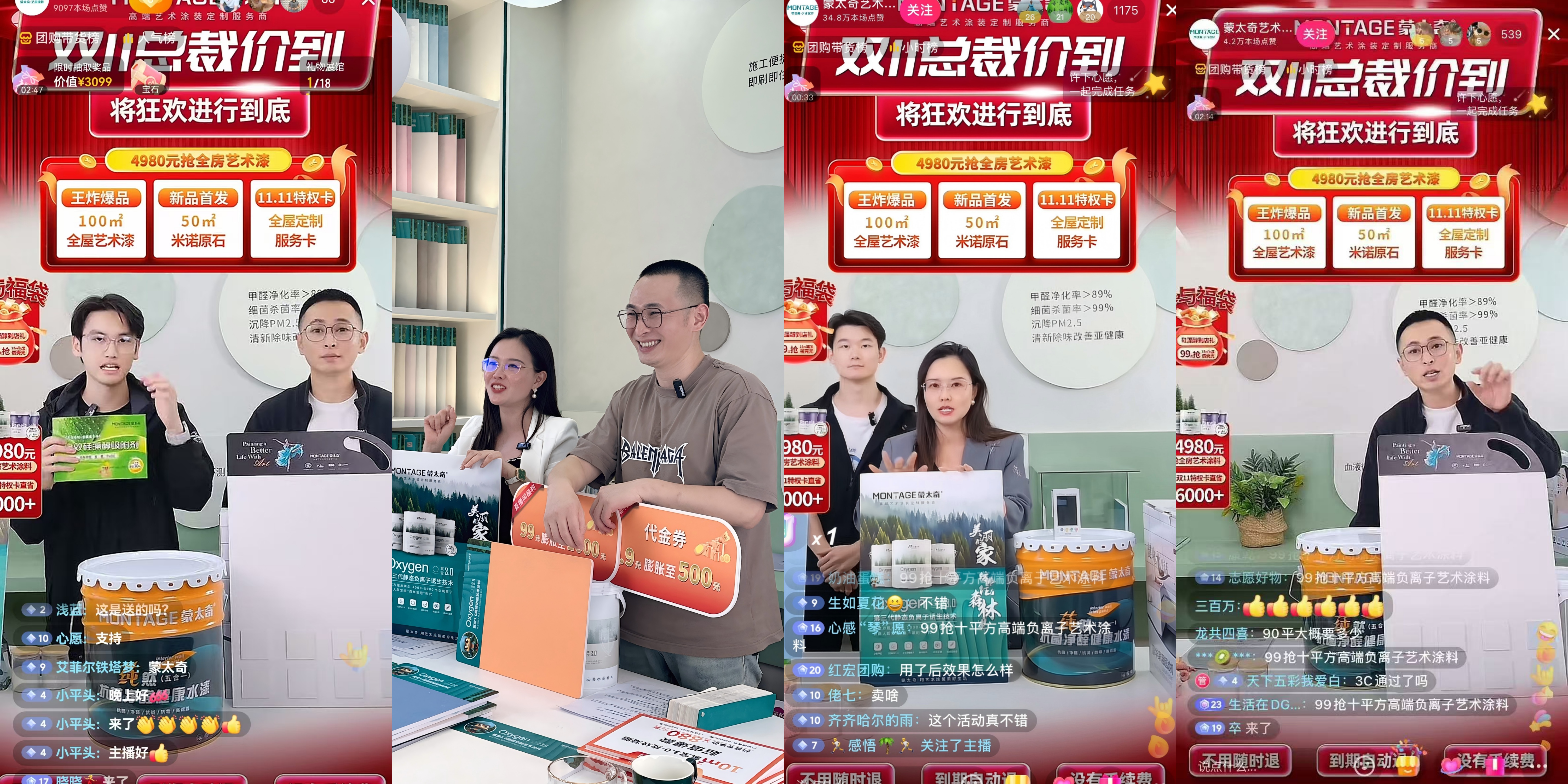 蒙太奇總部線上線下全渠道聯動,2024年12月7日至2025年1月5日期間,總部天天有直播,場場有驚喜,為消費者送福利。特別是在2024年12月31日至2025年1月1日,連續兩天舉行總裁跨年直播夜。蒙太奇聯合創始人、藝術塗料最美老板娘呂芳方,將親自擔任首席產品推薦官,帶你雲賞蒙太奇高品質塗料。