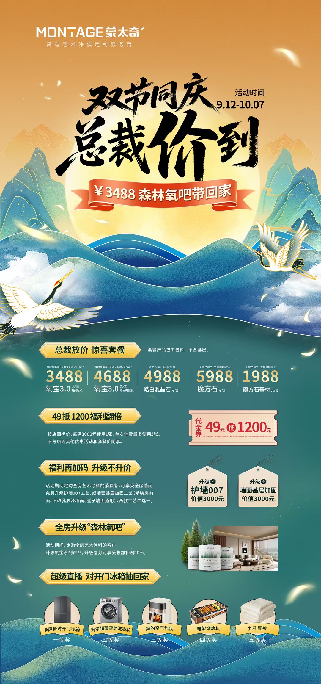 金秋送爽,雙節同慶。當中秋明月邂逅國慶華誕,9月12日至10月7日,蒙太奇藝術漆“雙節同慶,總裁'價'到”大促活動火熱來襲!迎中秋、慶國慶,我們特別推出氧寶係列產品升級钜惠,助您用超值預算打造綠色森林之家,讓團圓與美好在此相遇,輕鬆實現一站煥新家。
