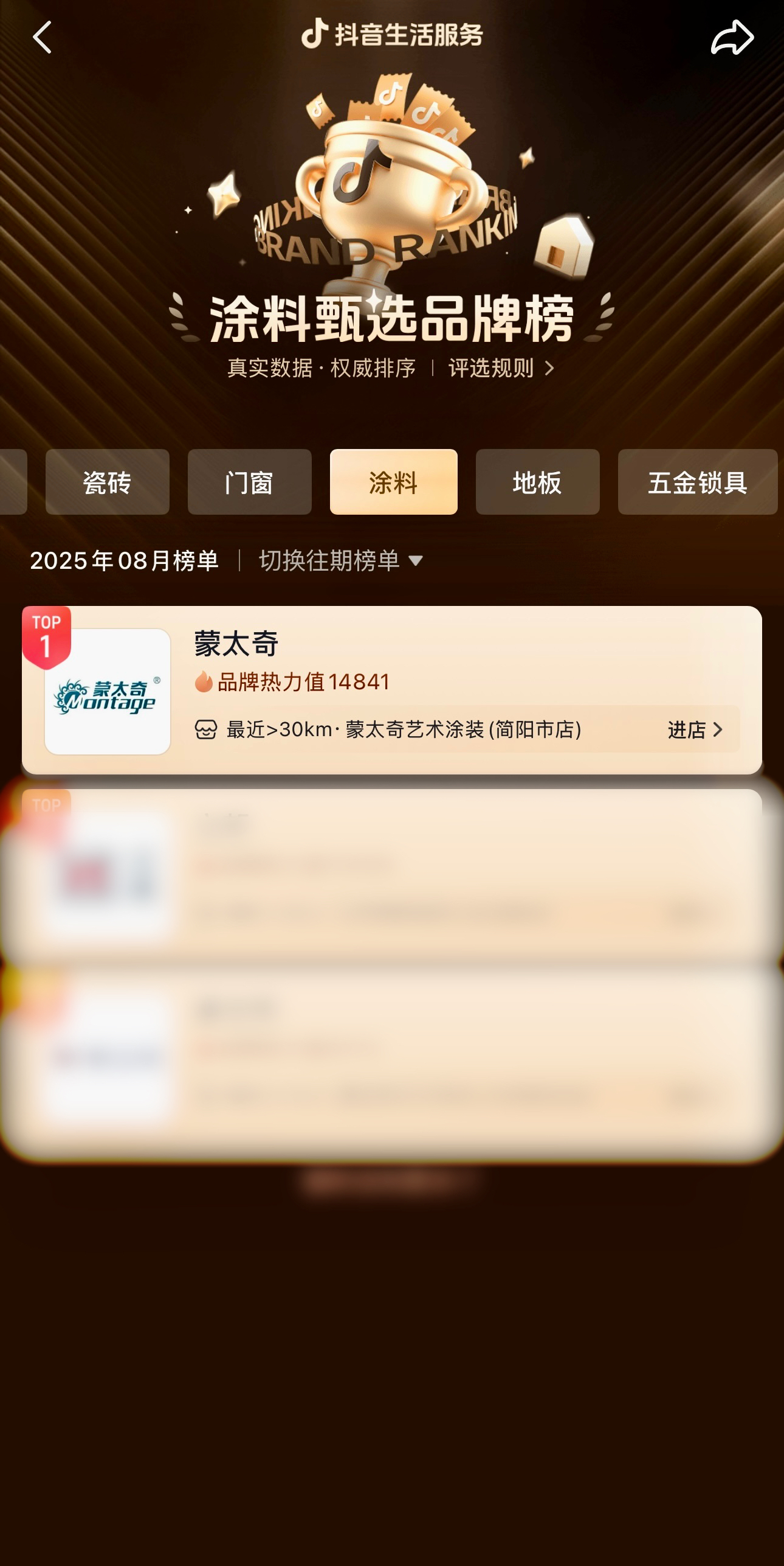 麵對家居消費場景向線上遷移的行業趨勢,蒙太奇藝術塗料率先布局抖音本地生活服務生態,構建"線上種草+線下體驗"的閉環鏈路,這一戰略布局迅速顯現成效:繼7月以黑馬姿態登頂【抖音生活塗料品牌榜TOP3】後,蒙太奇於8月再度突破,以絕對優勢榮膺榜單TOP1。這一榮譽不僅印證了蒙太奇在年輕消費群體中的影響力,更標誌著其從傳統渠道向數字化營銷的全麵轉型。